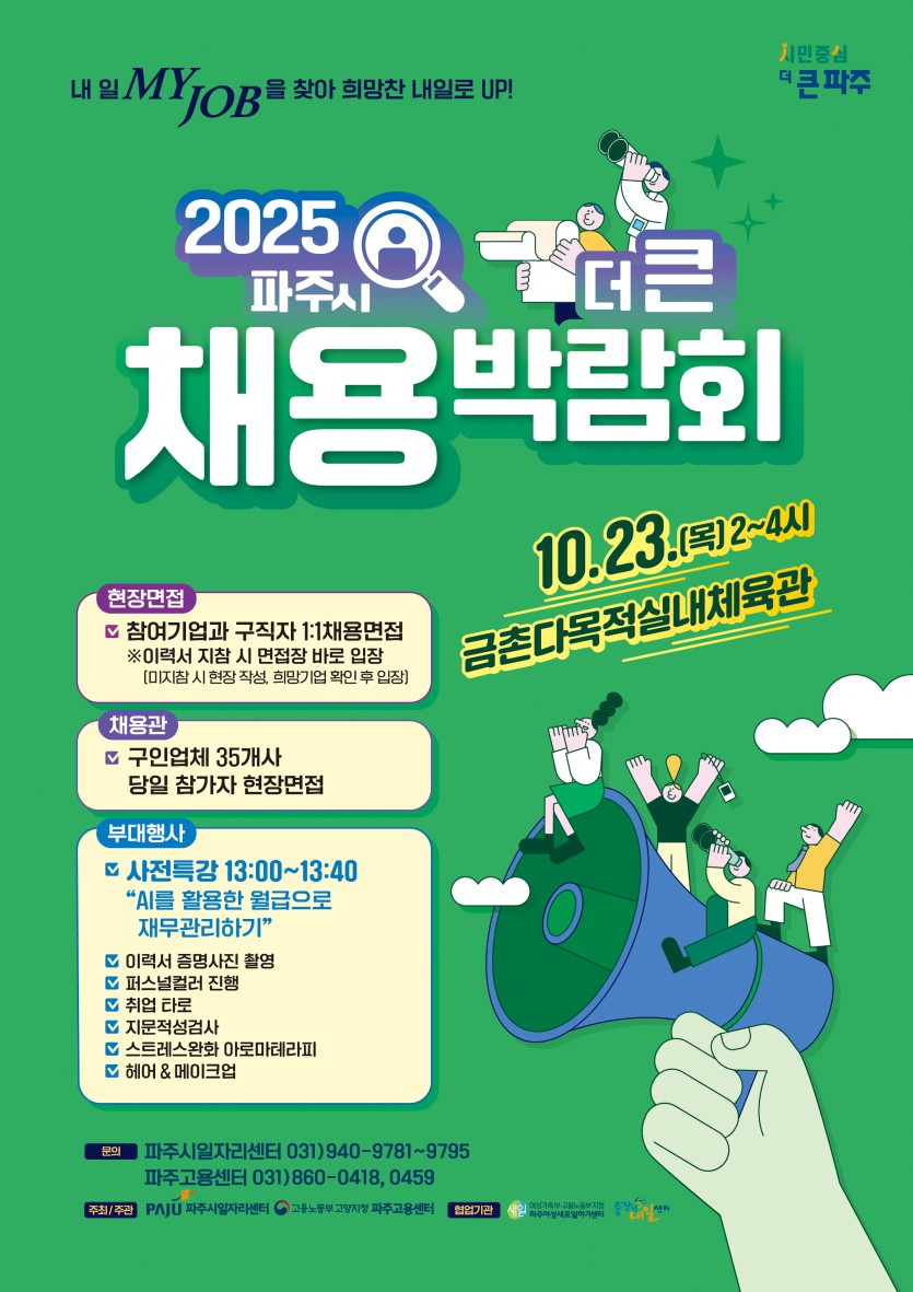 파주시가 주최하고 고용노동부 고양지청 파주고용복지센터가 주관하는 2025 파주시 더큰 채용박람회가 오는 10월23일(목)