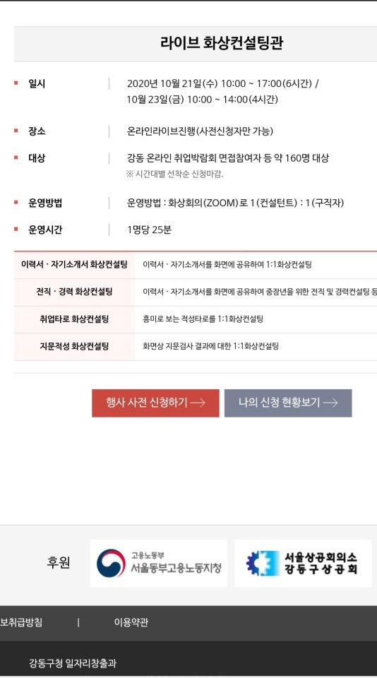라이브 1:1 취업컨설팅이 진행될 예정이니 참여하고자 하시는 분들은 반드시 사전 신청하여 주시기 바랍니다.