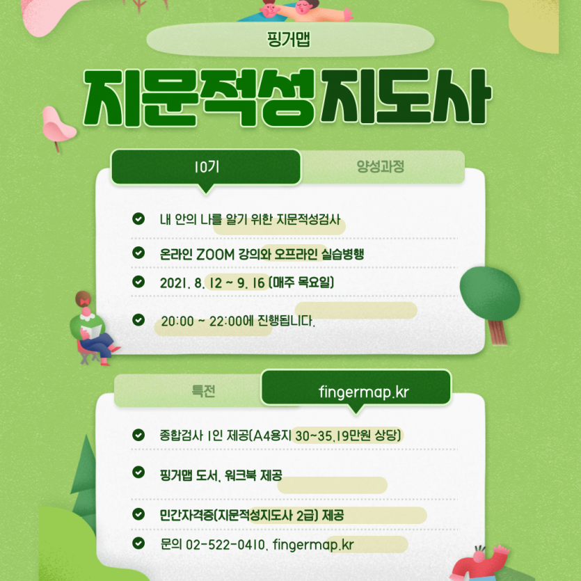 지문적성지도사 양성과정(2급) 10기 과정이 2021년 08/12~09/16까지 진행될 예정입니다.