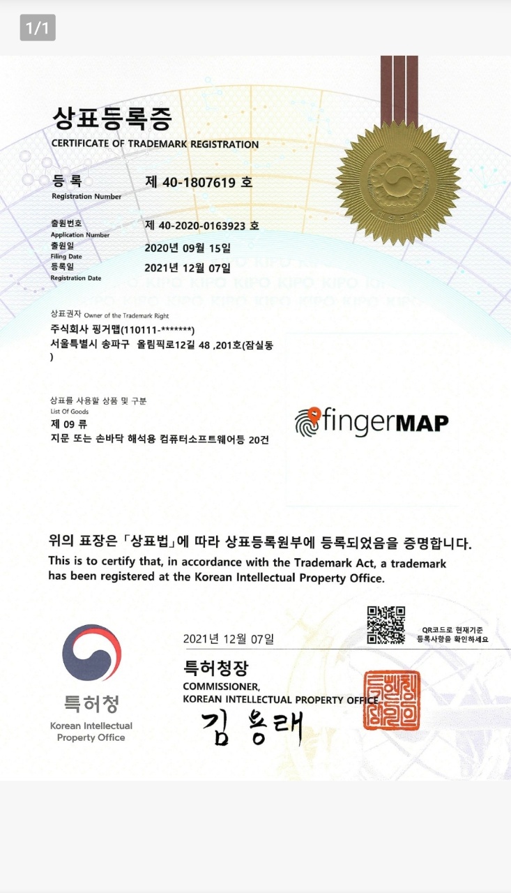 소식특허청 상표등록[핑거맵] 출원 이전페이지 다음페이지 페이지 정보 작성자 최고관리자 쪽지보내기 메일보내기 자기소개 아이디로 검색 전체게시물 쪽지보내기 메일보내기 자기소개 아이디로 검색 전체게시물 작성일21-12-20 19:41 조회126,176회 댓글0건 추천 0 신고 목록 페이스북 공유 트위터 공유 구글+ 공유 게시글 내용 상표등록증 제 40-1807619호, 출원번호 제 40-2020-0163923호 지문 또는 손바닥 해석용 컴퓨터소프트웨어 등 20건에 대한 상표등록이 특허청으로부터 승인이 되었습니다. 댓글 0 댓글목록 등록된 댓글이 없습니다.