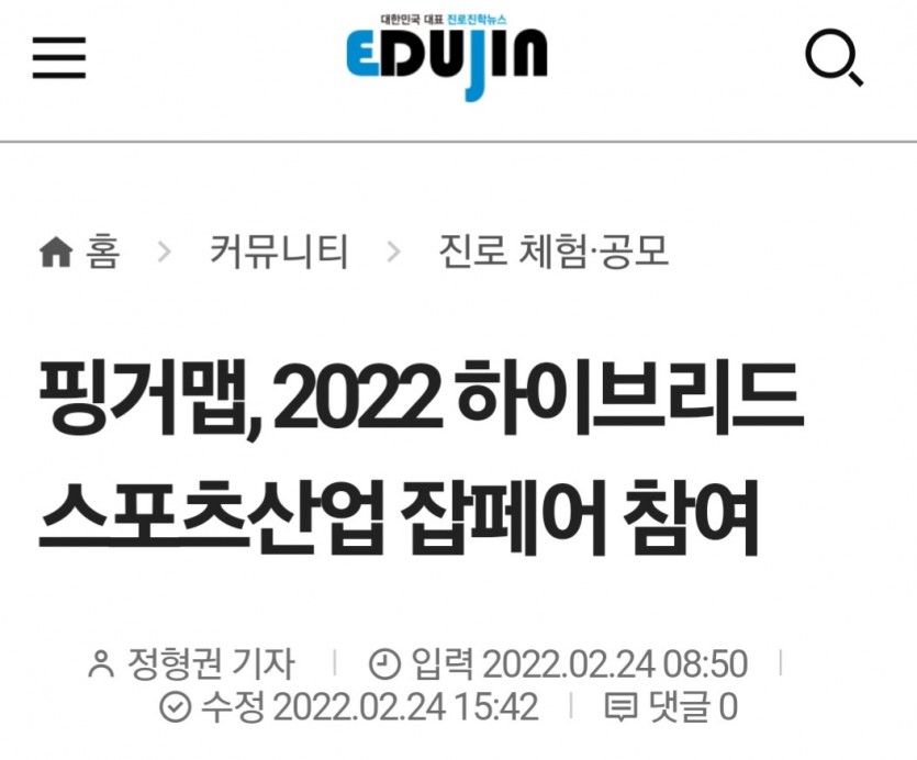 핑거맵, 2022 하이브리드 스포츠산업 잡페어 참여 < 진로 체험·공모 < 커뮤니티 < 기사본문 - 에듀진 인터넷 교육신문 (edujin.co.kr)
